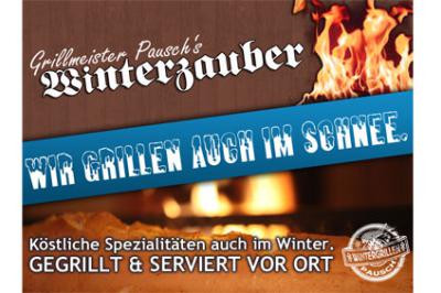 Wir grillen auch im Winter! Wir grillen bei Ihnen mit unserem Grillanhänger. Schnee und Regen sind kein Hindernis für uns.